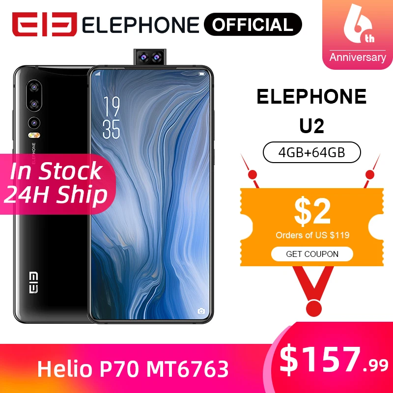 ELEPHONE U2 MT6771T Octa Core Mobile phone 4G/6G 64G/128G 16MP Pop-up Cam 6.26" FHD+ Screen Face ID